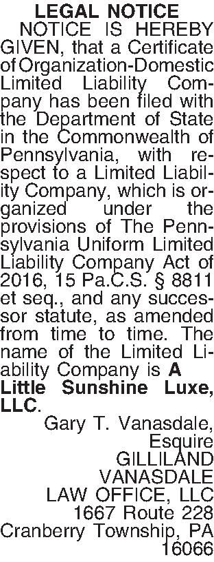 LEGAL NOTICE ¶ NOTICE IS HEREBY GIVEN, that a Certificate of Organization-Domestic Limited Liability Company has been filed with the Department of State in the Commonwealth of Pennsylvania, with respect to a Limited Liability Company, which is organized under the provisions of The Pennsylvania Uniform Limited Liability Company Act of 2016, 15 Pa.C.S. § 8811 et seq., and any successor statute, as amended from time to time. The name of the Limited Liability Company is A Little Sunshine Luxe, LLC. Gary T. Vanasdale, Esquire GILLILAND VANASDALE LAW OFFICE, LLC 1667 Route 228 Cranberry Township, PA 16066
