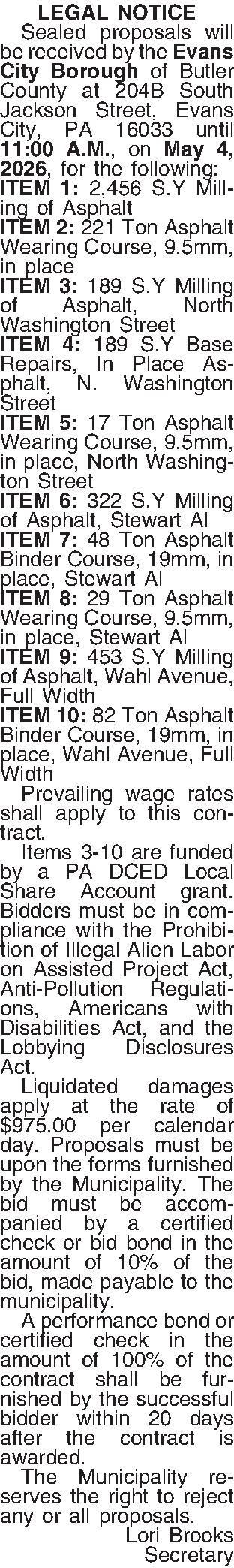 City Borough of Butler County at 204B South Jackson Street, Evans City, PA 16033 until 11:00 A.M., on May 4, 2026, for the following: