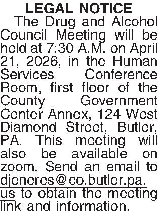 LEGAL NOTICE ¶ The Drug and Alcohol Council Meeting will be held at 7:30 A.M. on April 21, 2026, in the Human Services Conference Room, first floor of the County Government Center Annex, 124 West Diamond Street, Butler, PA. This meeting will also be available on zoom. Send an email to djeneres@co.butler.pa.us to obtain the meeting link and information.