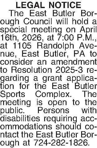 LEGAL NOTICE ¶ The East Butler Borough Council will hold a special meeting on April 16th, 2026, at 7:00 P.M., at 1105 Randolph Avenue, East Butler, PA to consider an amendment to Resolution 2025-3 regarding a grant application for the East Butler Sports Complex. The meeting is open to the public. Persons with disabilities requiring acc-ommodations should co-ntact the East Butler Borough at 724-282-1826.