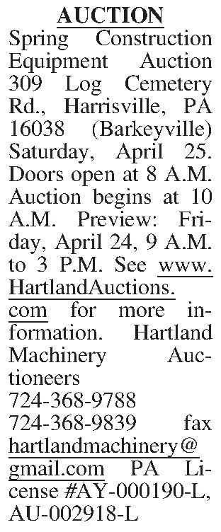 AUCTION Spring Construction Equipment Auction 309 Log Cemetery Rd., Harrisville, PA 16038 (Barkeyville) Saturday, April 25. Doors open at 8 A.M. Auction begins at 10 A.M. Preview: Friday, April 24, 9 A.M. to 3 P.M. See www.HartlandAuctions.com for more information. Hartland Machinery Auctioneers 724-368-9788724-368-9839 fax hartlandmachinery@gmail.com PA License #AY-000190-L, AU-002918-L