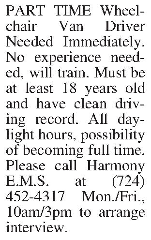 PART TIME Wheel-chair Van Driver Needed Immediately. No experience need-ed, will train. Must be at least 18 years old and have clean driving record. All daylight hours, possibility of becoming full time. Please call Harmony E.M.S. at (724) 452-4317 Mon./Fri., 10am/3pm to arrange interview.