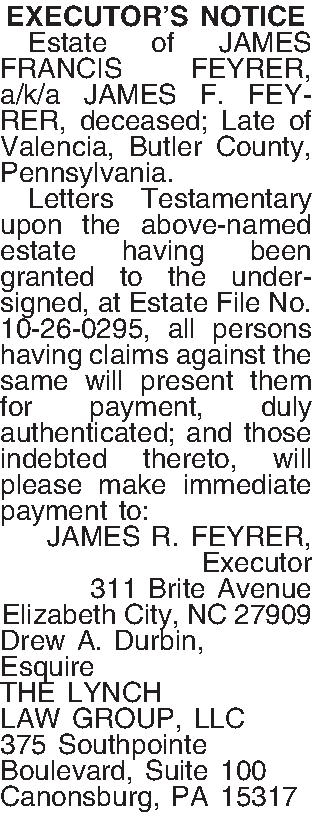 EXECUTOR’S NOTICE ¶ Estate of JAMES FRANCIS FEYRER, a/k/a JAMES F. FEYRER, deceased; Late of Valencia, Butler County, Pennsylvania. ¶ Letters Testamentary upon the above-named estate having been granted to the undersigned, at Estate File No. 10-26-0295, all persons having claims against the same will present them for payment, duly authenticated; and those indebted thereto, will please make immediate payment to: JAMES R. FEYRER, Executor 311 Brite Avenue Elizabeth City, NC 27909 Drew A. Durbin, Esquire THE LYNCH LAW GROUP, LLC 375 Southpointe Boulevard, Suite 100 Canonsburg, PA 15317