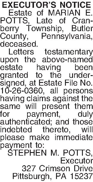 EXECUTOR’S NOTICE ¶ Estate of MARIAN E. POTTS, Late of Cranberry Township, Butler County, Pennsylvania, deceased.¶ Letters testamentary upon the above-named estate having been granted to the undersigned, at Estate File No. 10-26-0360, all persons having claims against the same will present them for payment, duly authenticated; and those indebted thereto, will please make immediate payment to: STEPHEN M. POTTS, Executor 327 Crimson Drive Pittsburgh, PA 15237