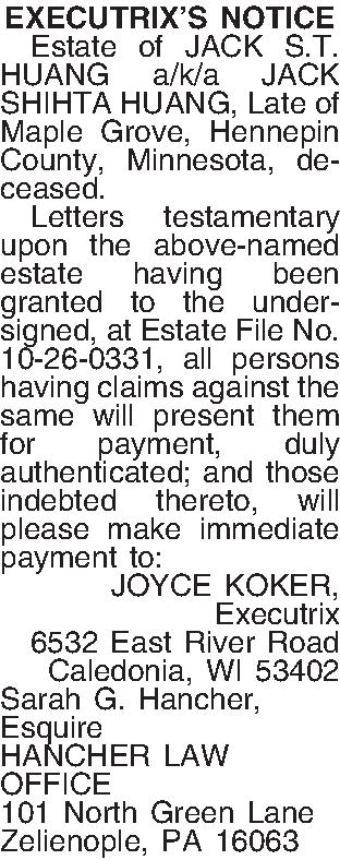 EXECUTRIX’S NOTICE ¶ Estate of JACK S.T. HUANG a/k/a JACK SHIHTA HUANG, Late of Maple Grove, Hennepin County, Minnesota, deceased. ¶ Letters testamentary upon the above-named estate having been granted to the undersigned, at Estate File No. 10-26-0331, all persons having claims against the same will present them for payment, duly authenticated; and those indebted thereto, will please make immediate payment to: JOYCE KOKER, Executrix 6532 East River Road Caledonia, WI 53402 Sarah G. Hancher, Esquire HANCHER LAW OFFICE 101 North Green Lane Zelienople, PA 16063