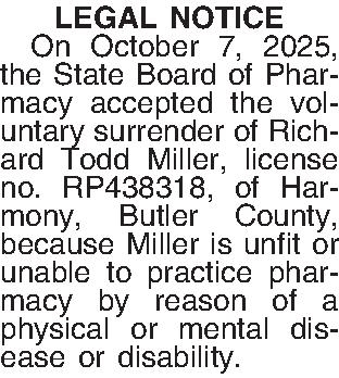 LEGAL NOTICE ¶ On October 7, 2025, the State Board of Pharmacy accepted the vol-untary surrender of Richard Todd Miller, license no. RP438318, of Harmony, Butler County, because Miller is unfit or unable to practice pharmacy by reason of a physical or mental disease or disability.