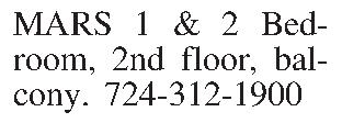 MARS 1 & 2 Bedroom, 2nd floor, balcony. 724-312-1900